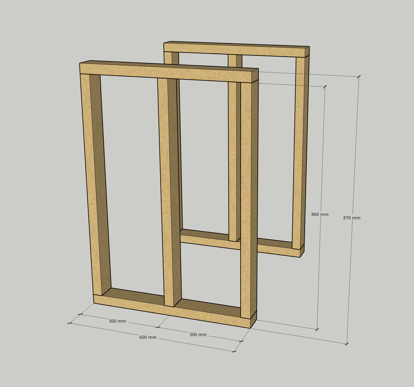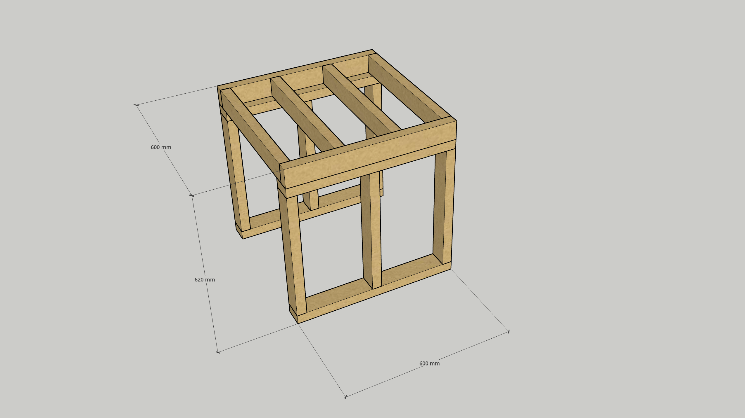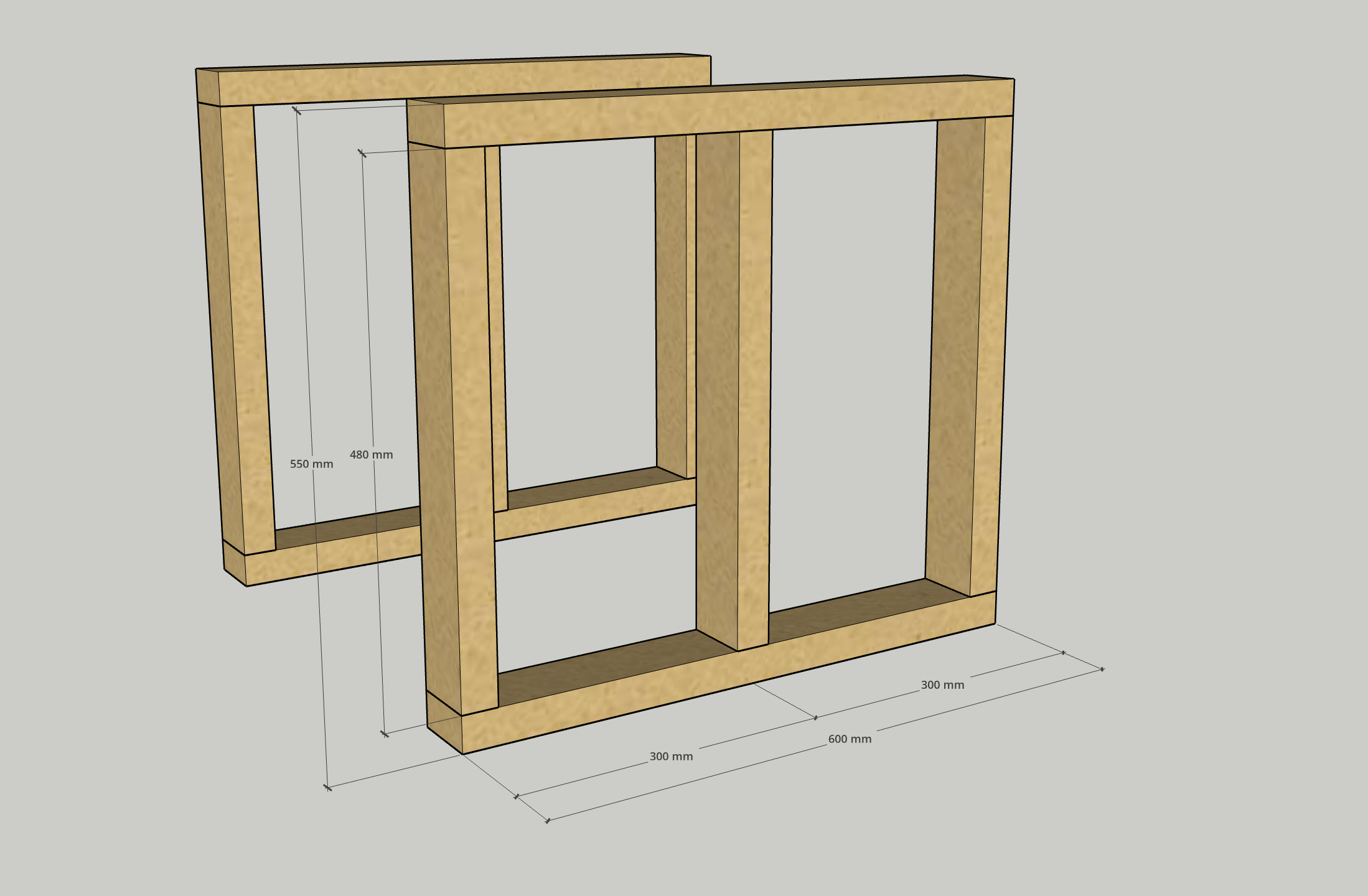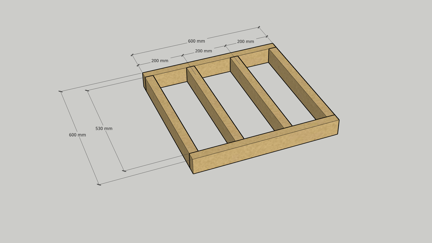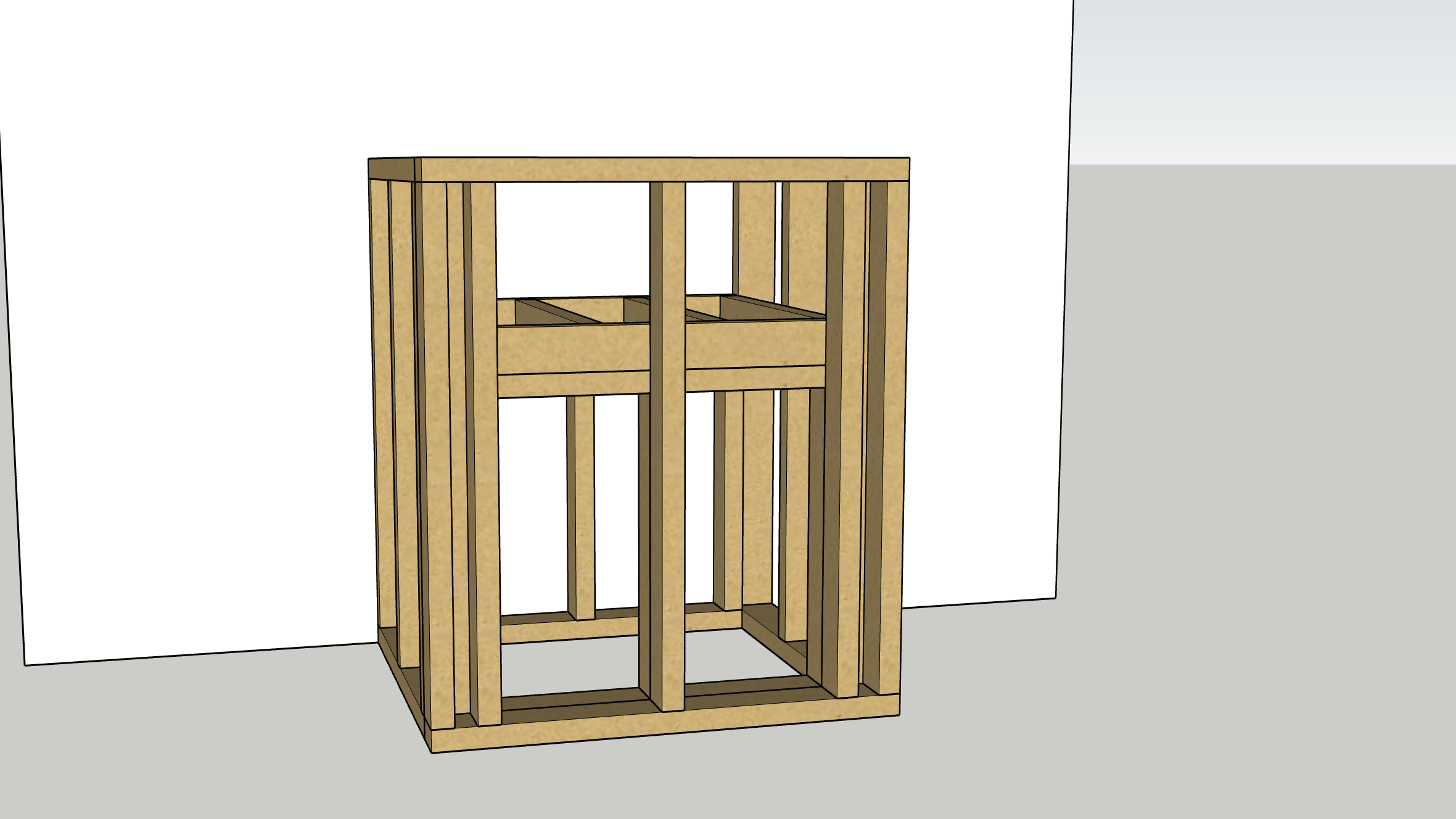 You will start by creating a platform that will act as the bottom of the basin, where the water sits and the drain is attached. As this will need to support weight, it is a fairly sturdy platform. It is made of three separate frames that are nailed together. Please note that the dimensions are arbitrary but will be similar to what was used in the video.