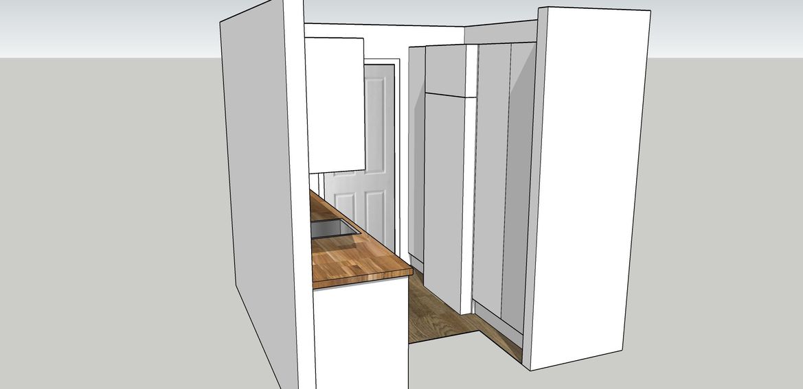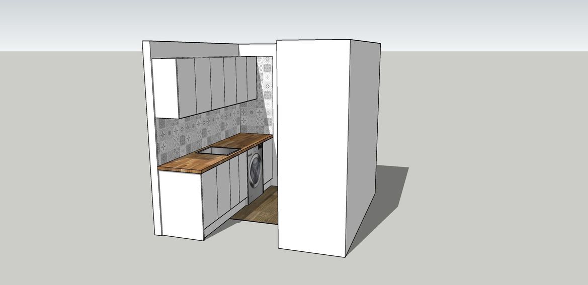 The same can be said over at the other side where the washing machine is. I suggest removing the wall near the laundry tub and opening your laundry area. With the proper design enhancements, it will become a feature of the house instead of just the wash area. I've placed some diagrams below for your consideration. If you wish to see it in another configuration, please let me know.