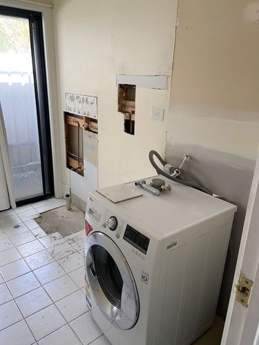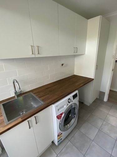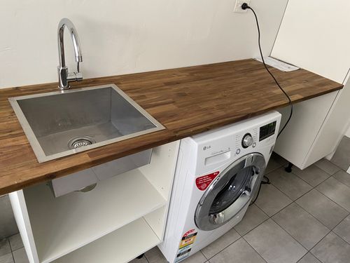 Electrician installed a double power point in the broom cupboard for easy access to the washing machine and dryer plugs. also replaced my single power point with a double above the bench