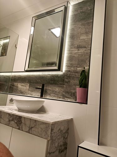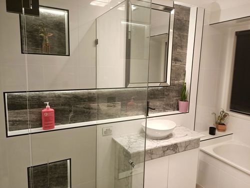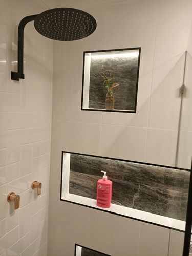 Bathroom Reno, i dont have any original photos i dont think but general layout was the same and i just framed up another wall at the back of the bathroom to then give me the depth required for such a large niche and for slate tiles that were nearly 15mm thick. Overall i am super stoked with how it turned out, as for colours i tend to follow the contemporary sort of style with some higher end bits and bobs like marble and the slate stone feature tiles to give the colour and make it pop, black trim was also key in making the white tiles pop. Overall it cost me under 4k