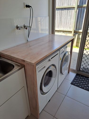 The finish you've achieved is perfect and great thinking about spacing out the benchtop to allow the water inlet and cords to pass behind. I did a similar bench in my laundry, and it's made a world of difference to functionality. I'm sure your new bench will serve you well.