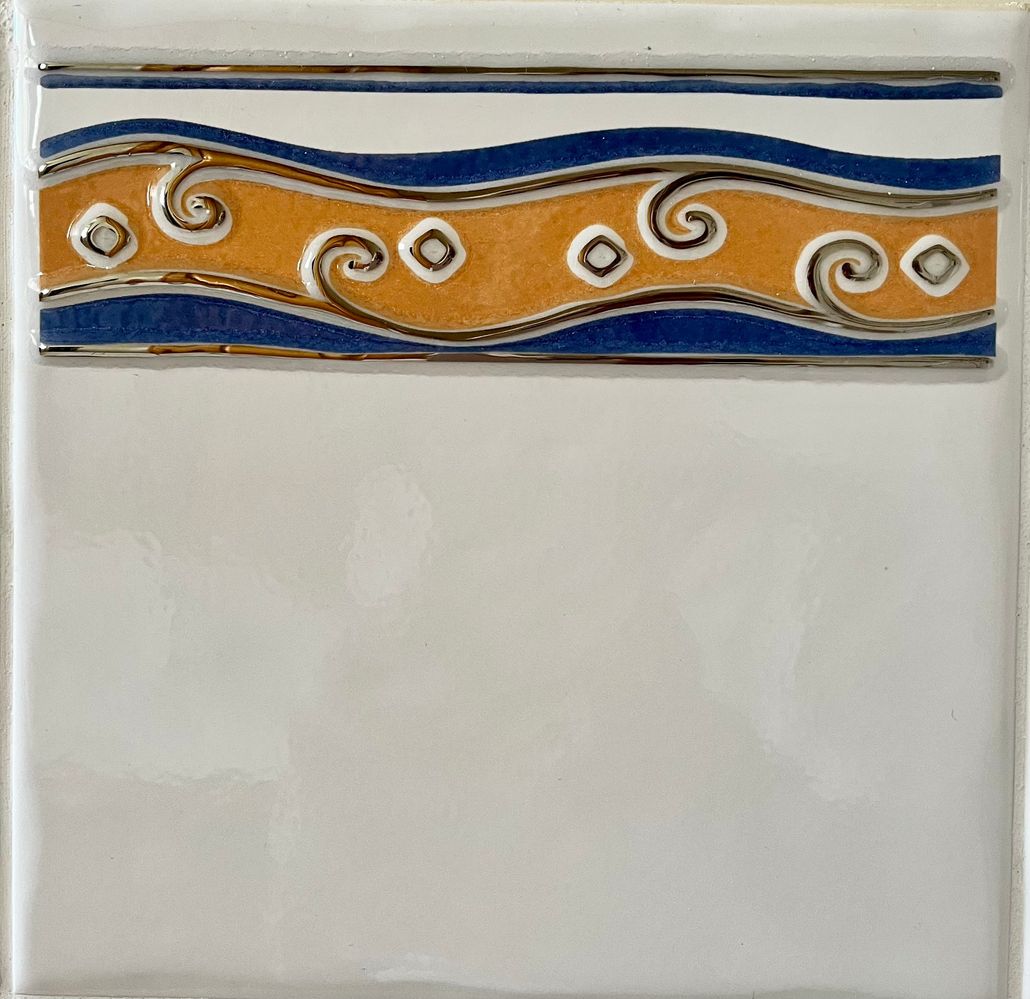 The closest I could find is the Johnson Tiles 200 x 200mm Ultra White Ripple 1.52sqm. I'm sorry but I could not find an equivalent for your gold trim border tile. However, I propose looking at the option of covering the holes with Selleys 50g Knead It Aqua Epoxy Putty and touching it up with Rust-Oleum Tub And Tile Touch Up Kit.