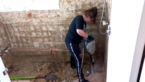 We hired a plumber, then we refilled the hole, a friend concreted the floor and we are now hiring a Tiler! 2 more weeks and we should be done and it's cost us less than $10,000