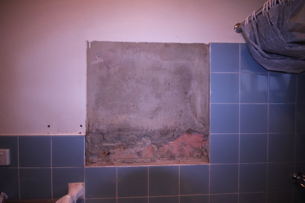 I'm doing a DIY bathroom reno and just yanked the old medicine cabinet off the wall... I expected to see exposed bricks but there's this concretey grey stuff on top of the bricks (that I assume is the same adhesive behind the tiles themselves?).