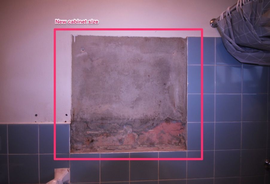 The new cabinet is larger than the hole left by the old one, see the third image below with the outline of where the new one will sit.