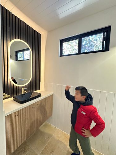 I love the castellated battens, the cladding on your vanity and the VJ panels. The vertical lines give the room great texture and make what could be a dull space rather interesting to look at.