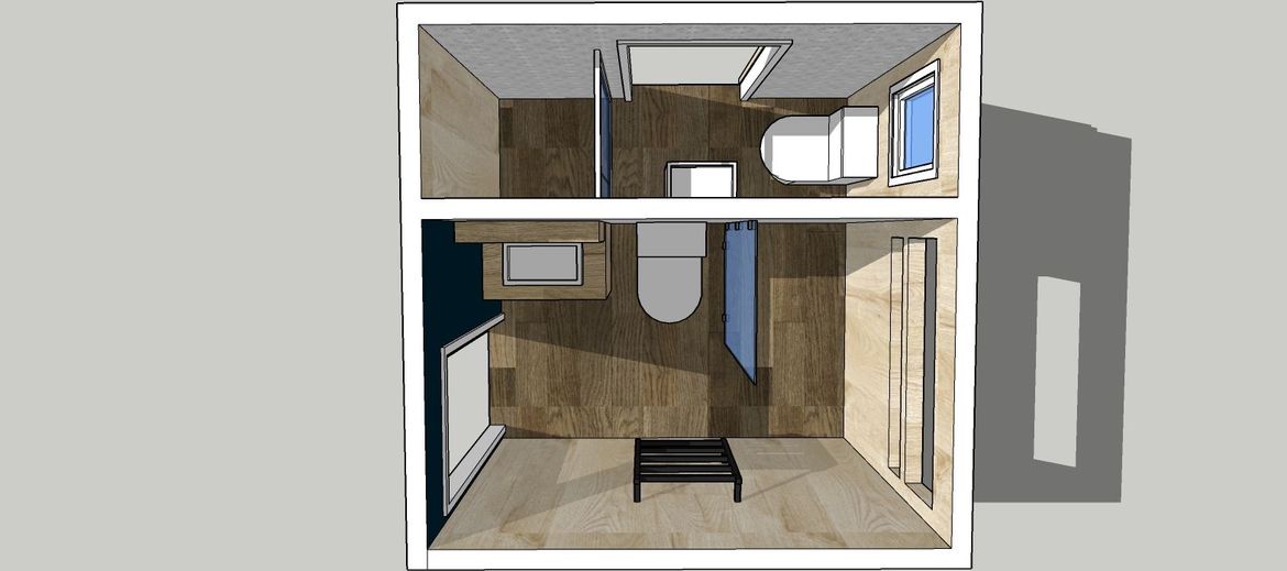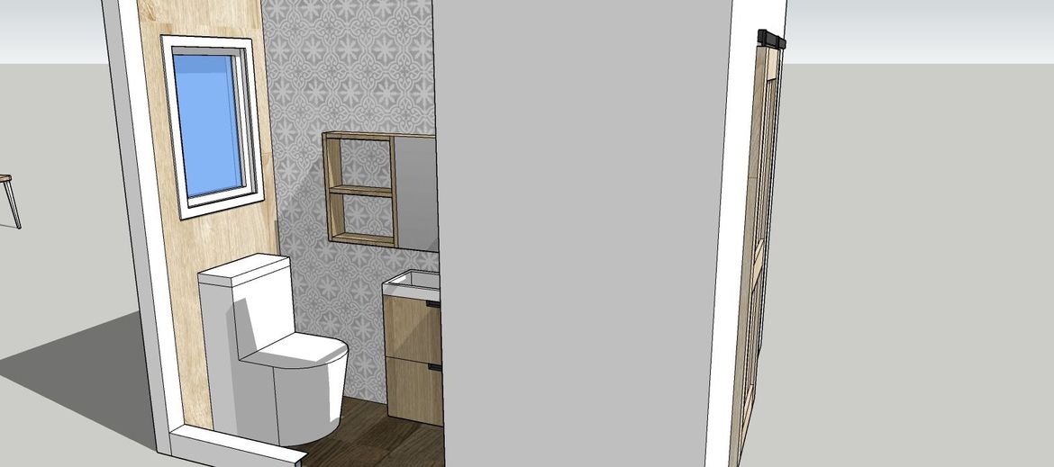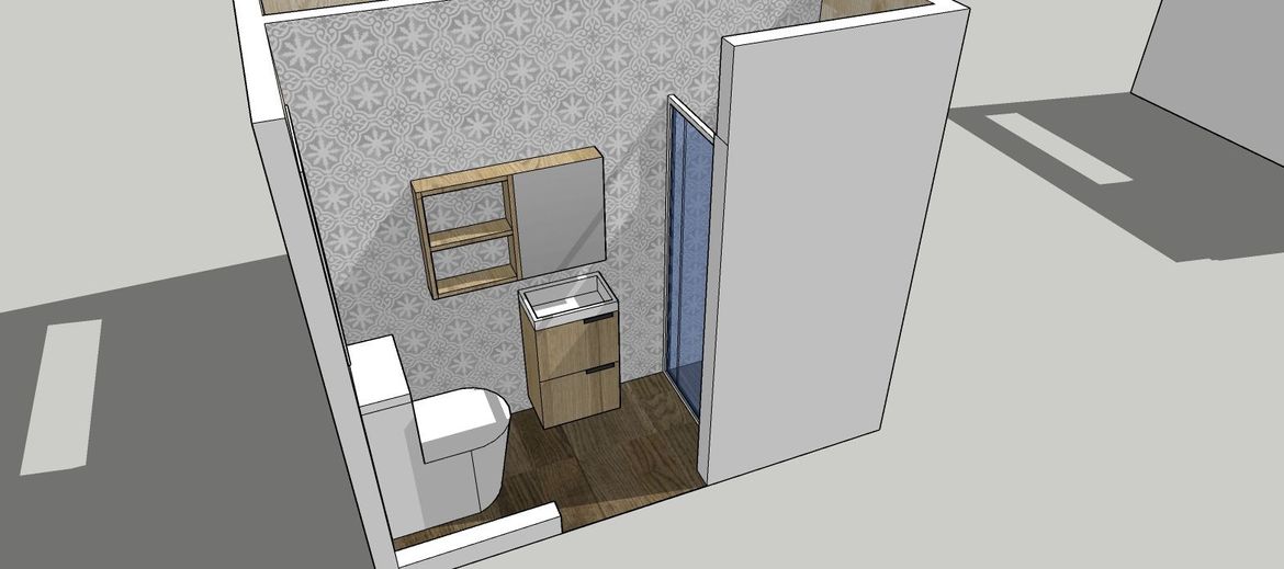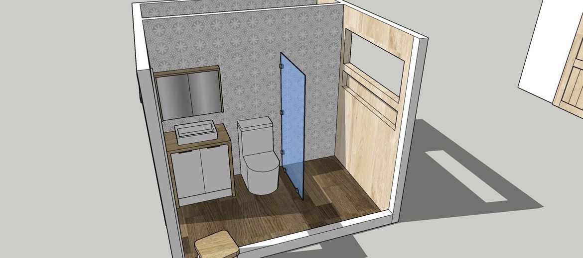 As for the new shower and the vanity in the second toilet I recommend Rick McLeans shower door kit ( photo at bottom ). As for the vanity you can get only a compact 450 wide floor standing or wall hanging unit. It must be a square basin to maximize the opening space of the shower door. You can't get a semi recess basin as it will impact on the shower door swing making it very difficult to get in to the shower. Tile choice is up to you, you can get a timber tile look that appeals to you. I hope the drawings help you to visualize how your new bathrooms will look. If you have any more questions please post here at workshop. Good luck and stay safe.