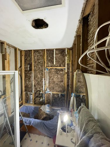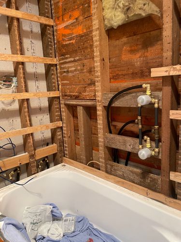 Prep treated pine sections as noggins/studs to affix plumbing and to allow a 1600x800 hinged bath screen fixture later. Get sparky to disconnect and check (switch board is behind our shower wall... I freaked but it's ok but can be relocated later) plumber rough in.
