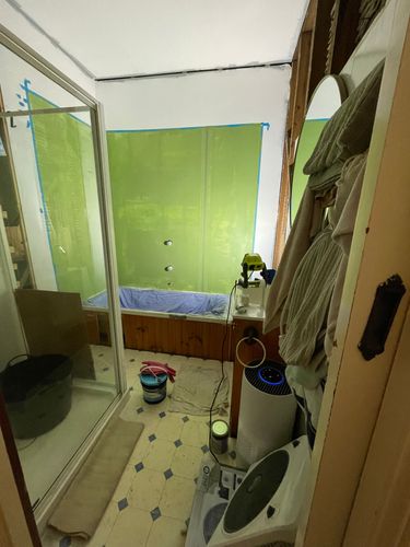 Our ugly-but-interesting 4m2 bathroom (1940s 'bank home' 1 🛀 3 🛏️ ') needed a half-at-a-time back-to-studs renovation on a budget. (4.5k?) This is just Stage 1: est. shower over existing bath to allow leaking shower removal (every surface and the subfloor will be replaced - watch this space). Had to do my research to figure out how to use these wet walls... seems they are stocked and sold but not used by anyone in the trade... I did ask a LOT of qns of a lot of people. Pending: WallArt review and Stage 1 cost ($550?) Excl. plaster and electricals totalled later.