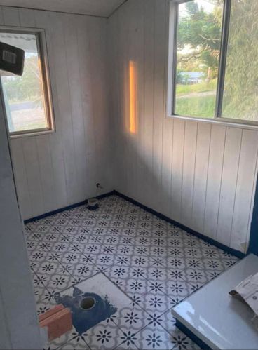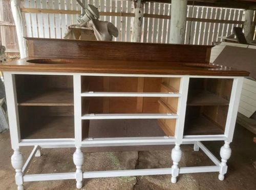 I designed and created space for an ensuite in my old Queenslander. I repurposed a sideboard as the vanity and bought it all into fruition. I am very happy with the results. The cut out timber have become my chopping boards.