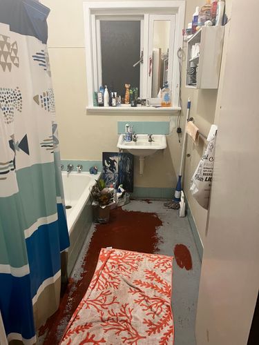 You might like to start a discussion about your bathroom, as many of our members, including myself, are renters. I'm sure we can come up with some ideas that will improve the look of your bathroom and that your landlord will find acceptable. Repainting the floors and a coat of paint on those tiles would be great starts. You'll find that if you offer to do the work and pay for the materials, landlords are generally quite open to having a conversation about improving a property.