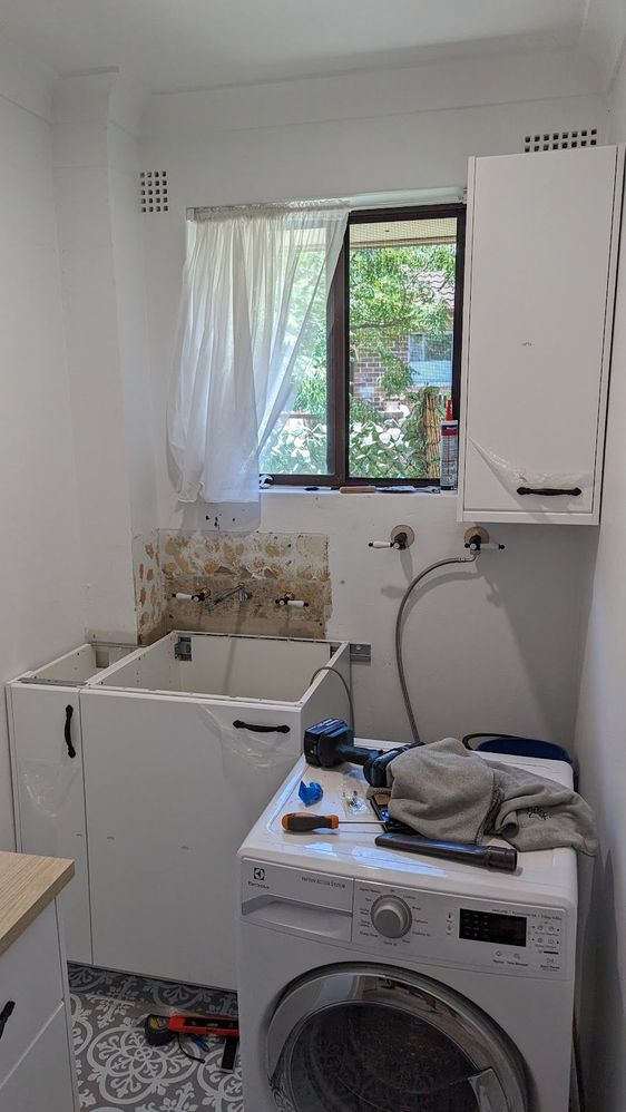 Additionally we removed the existing few tiles behind the laundry sink and the existing sink itself, which was cemented into the wall.