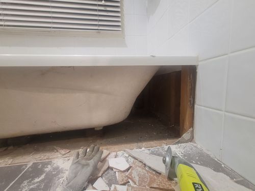 Next, start cutting away those upright lengths of timbers that are supporting the bath, not the wall studs. You might find the bath has a bead of silicone between it and the tiles. Cut through this with a utility knife. Then, get that prybar under the lip of the bath and lever it up away from the supporting frame at the back. It could have been glued to the timber frame, so you might need to cut through it or lever the frame off the wall studs.