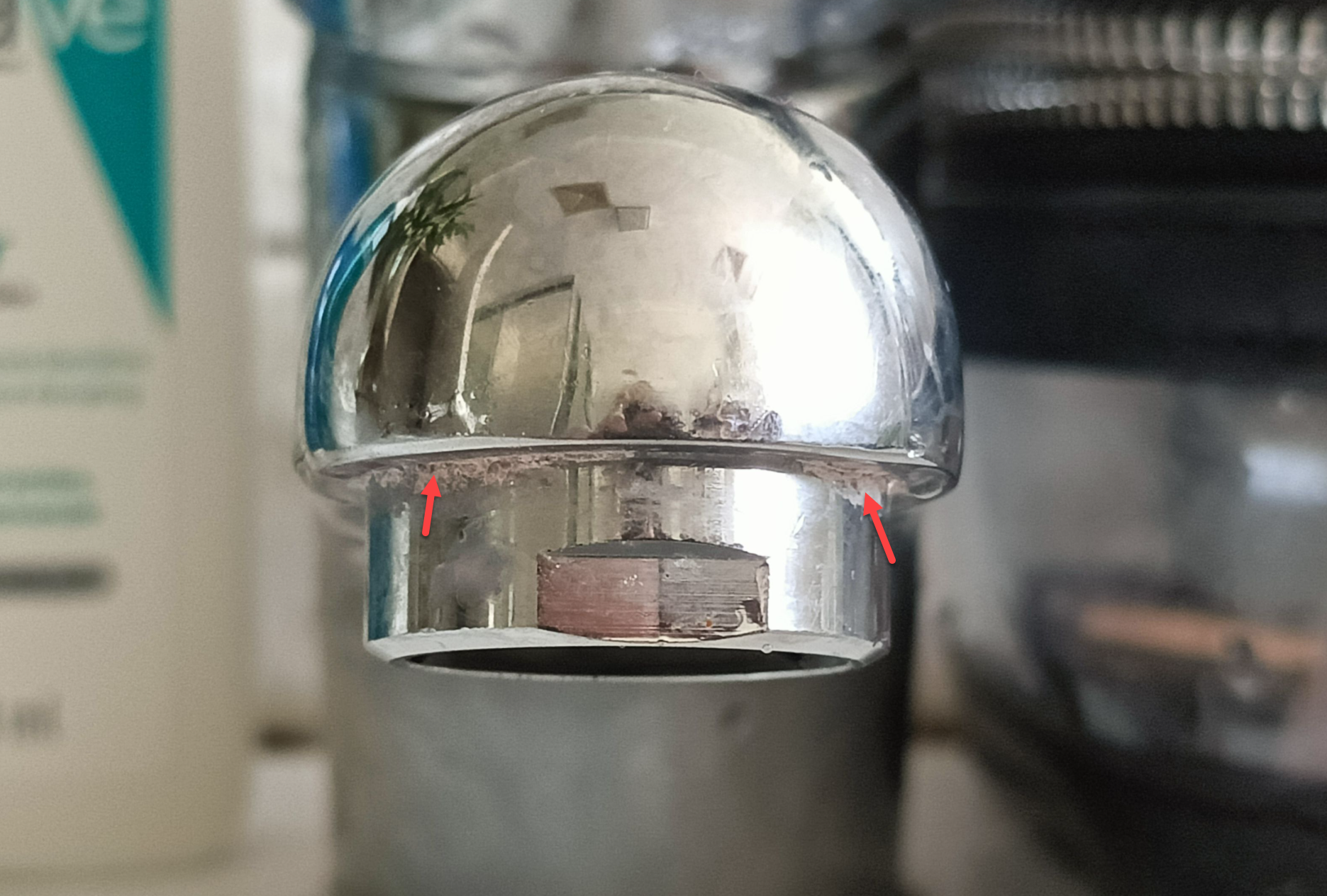 The calcium or limescale buildup that you can see around the bottom cylindrical piece implies there is a seam here that small amounts of moisture have come through.