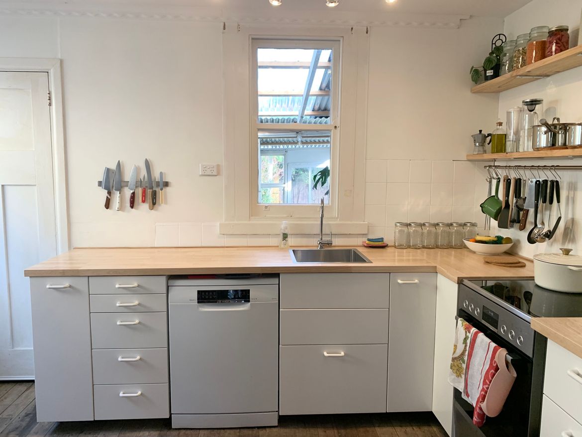There were three busy days of pulling out the old kitchen, painting, installing the new kitchen, linking up the sink and the dishwasher, and installing the benchtop.