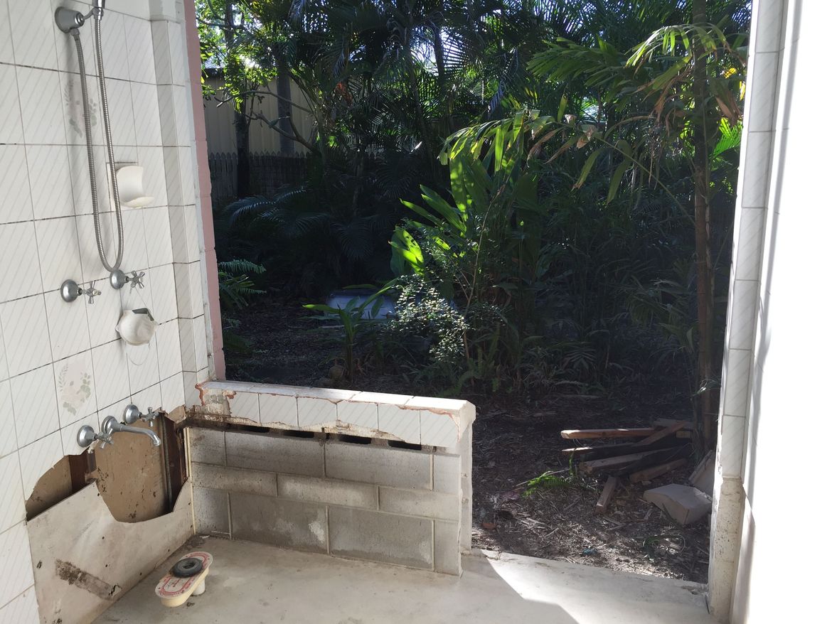 Removed old bath tub, sliding window and partially removed wall to allow doorway access to garden.