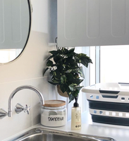 Since then we’ve put a dryer there so I moved the shelf and now just have a plant hanging on the taps to cover them.