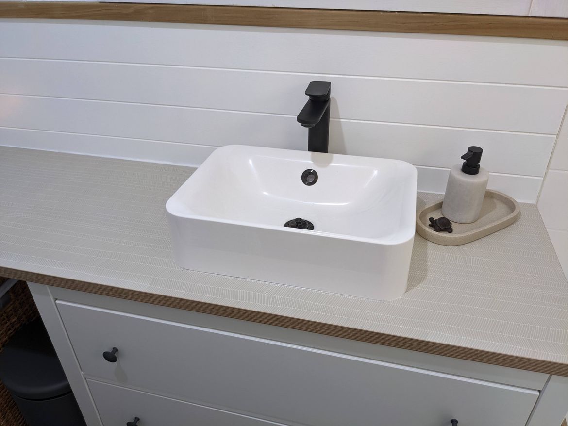 The Caroma long-head mixer and the above-bench basin give the vanity a fresh, modern look. I’ve always loved the look of above-bench basins and finally had the chance to install one here. We originally picked a mixer that was too low – but that one went to the kitchen, so it worked out well.
