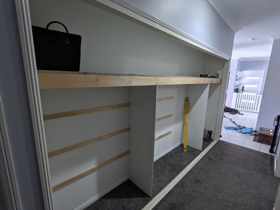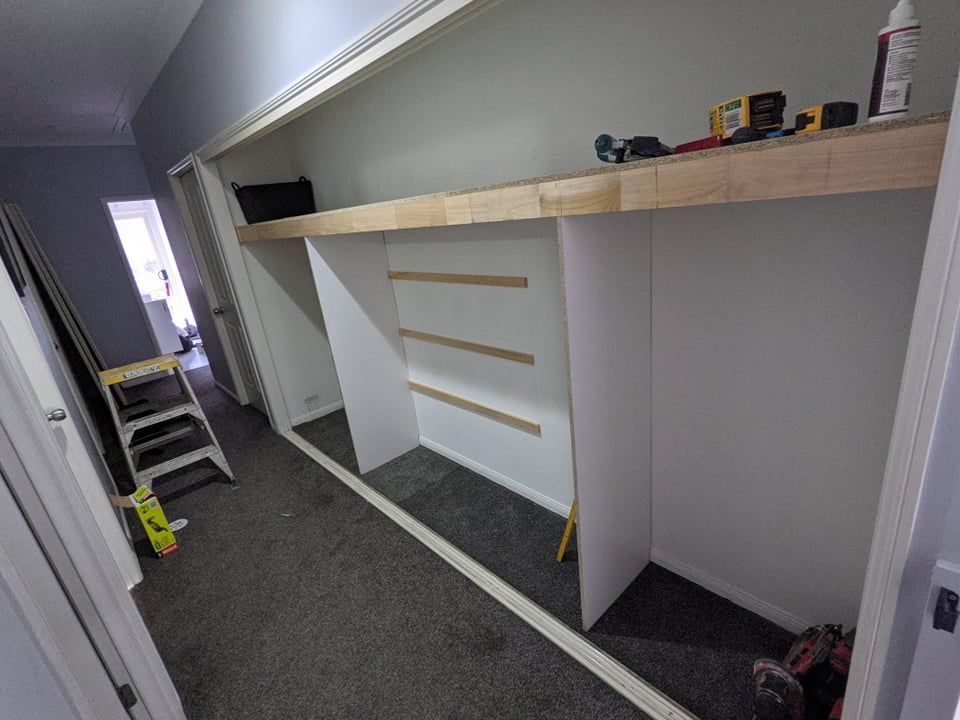 The support system was installed first. The top full-length board is actually two precise cuts of the Melamine.