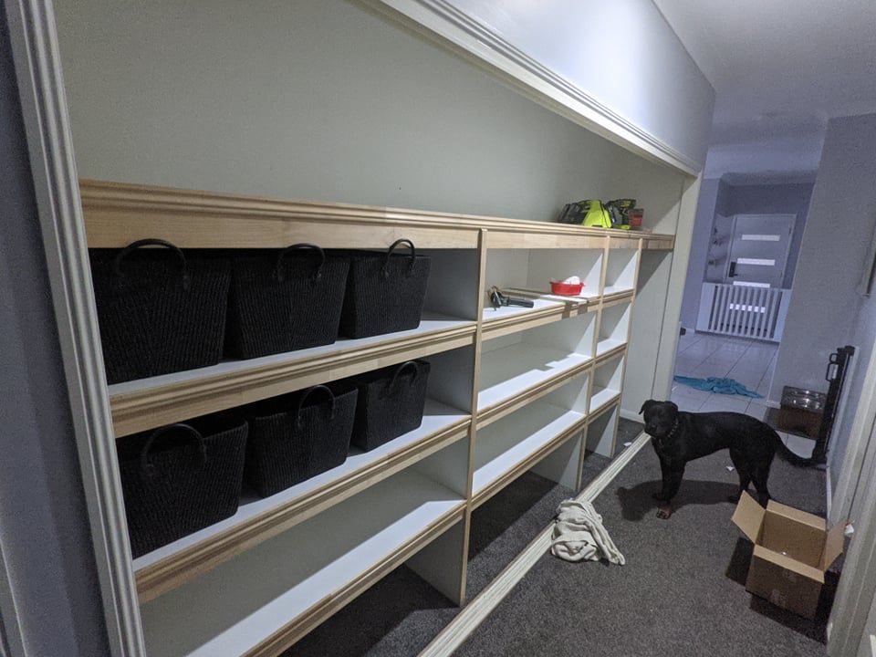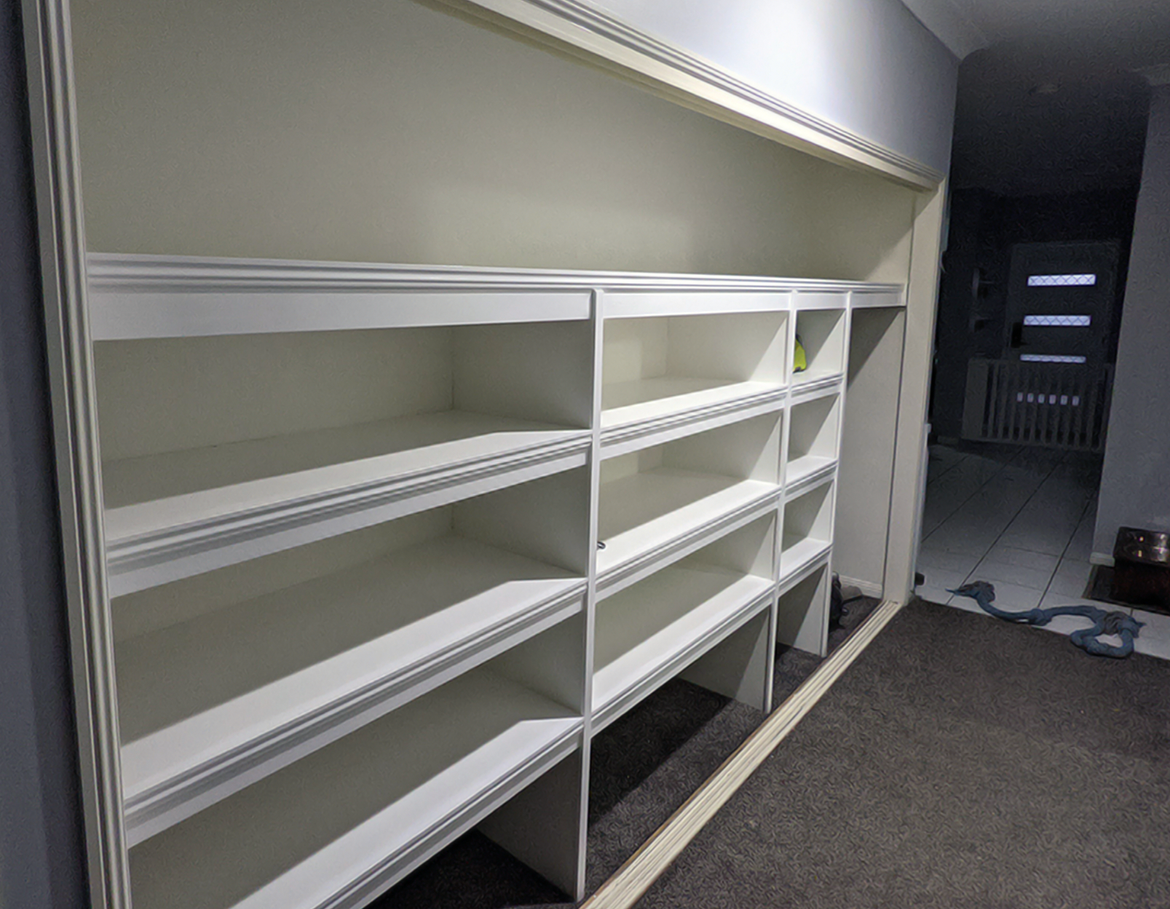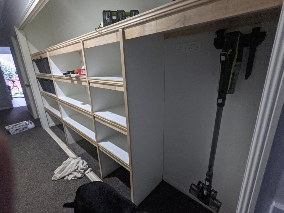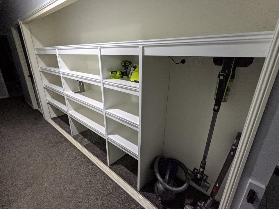 This linen closet rebuild replaced an unsuitable wire storage system with sturdy, modern shelving and power points for charging a vacuum cleaner and tools.