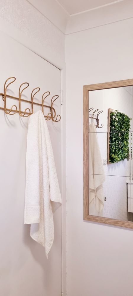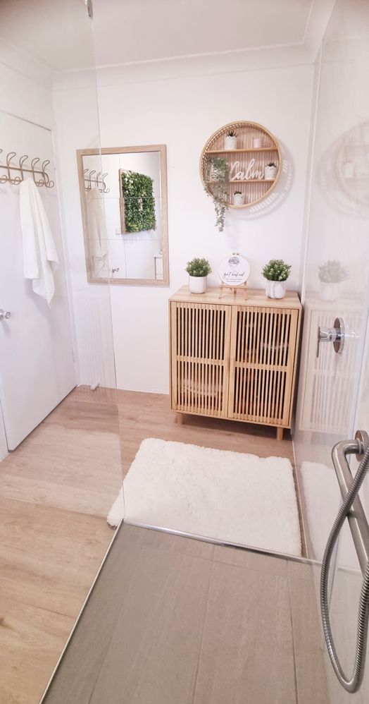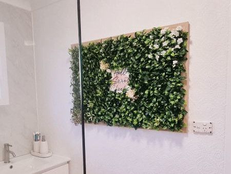 The embroidery hoop décor and greenery wall art opposite the shower is something else I made using Bunnings artificial plant grids. I also used Kmart flowers and a picture frame to add a bit of texture and a pop of colour.