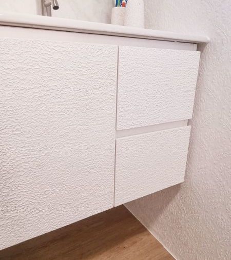 We were extremely lucky to have scored the bathroom vanity from our local Bunnings store. It was on clearance for just $70. However, I wasn't happy with how plain it was, so I took the door and drawers off, sanded it back and applied a texture paste to hand create a unique texture design, which I then painted afterwards.