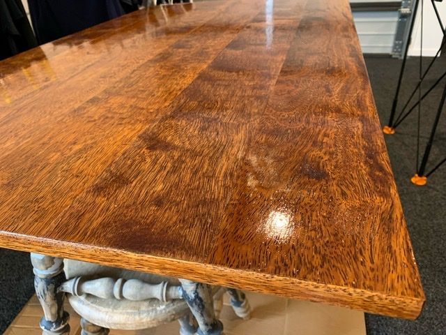 I bought the Kwila decking timber and got the circular saw to trim the edges. I wasted a few pieces as it didn't quite work out the way I wanted. I glued them together and clamped them. Then I used clear varnish, applying three coats. It was shining when it was drying but became matte when it dried.