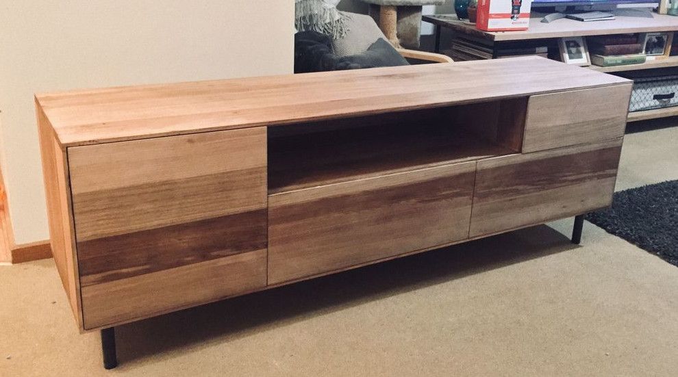 Workshop member stackhat built this lowline Tasmanian Oak entertainment unit, which includes drawers, flip-down door cupboards and an open shelf.