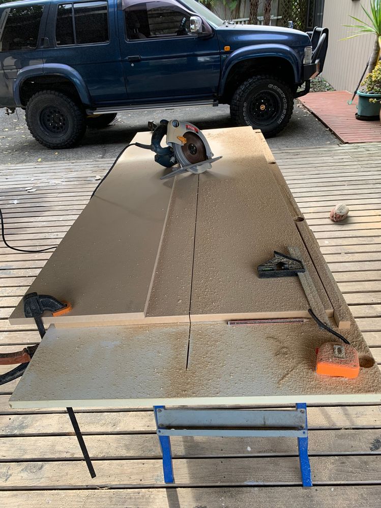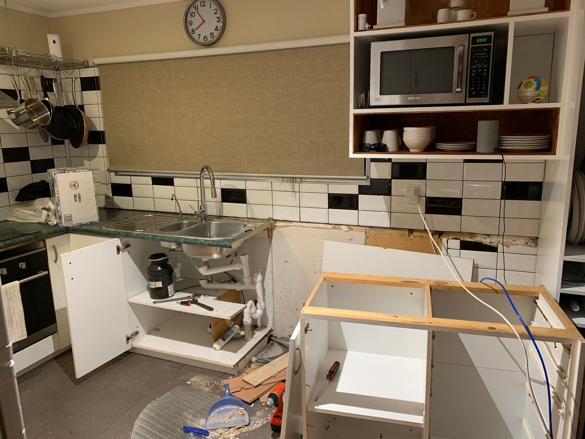 We put in new Kaboodle Hevea benchtops from Bunnings. Here is me cutting out the hole for the sink.