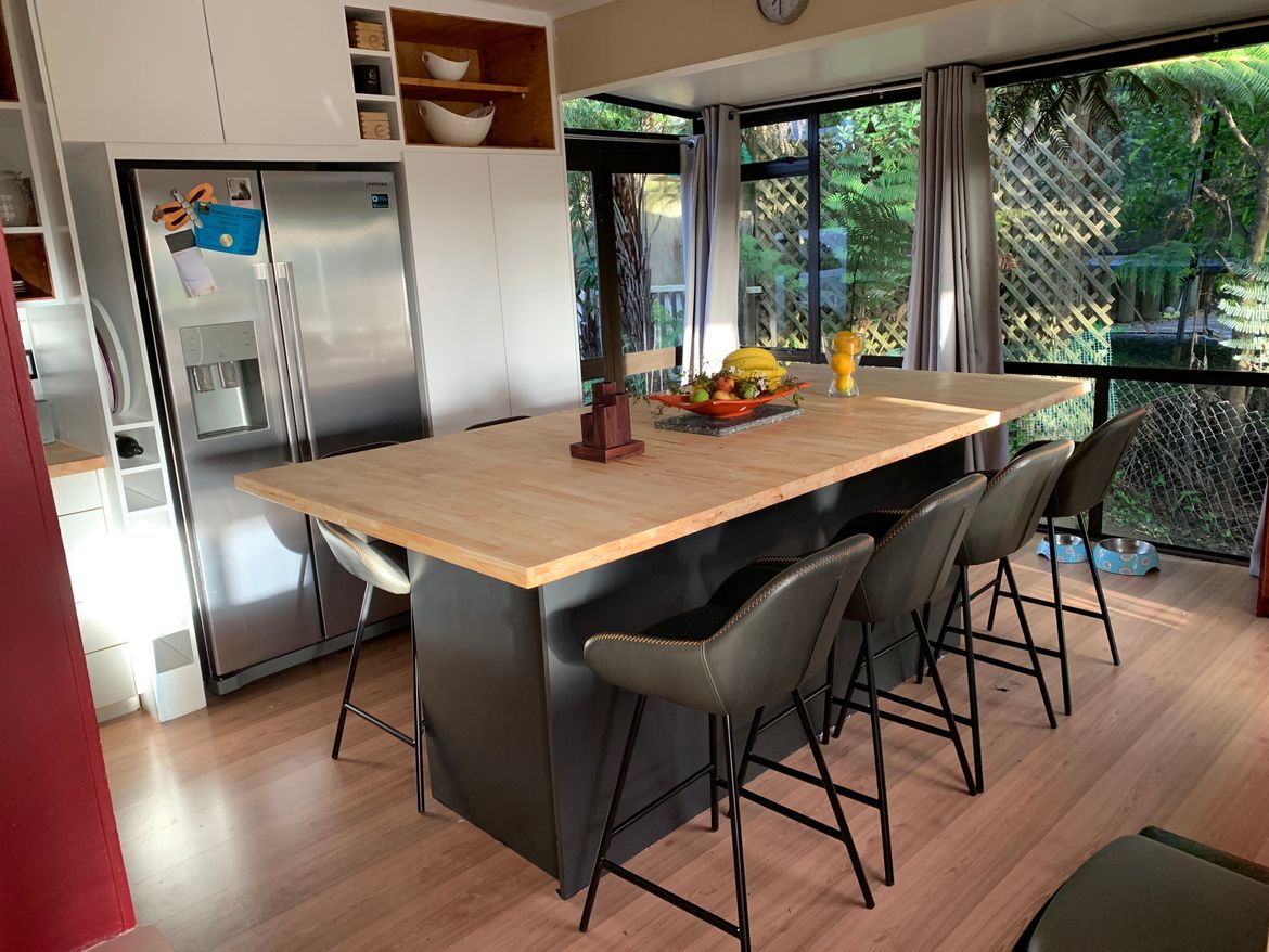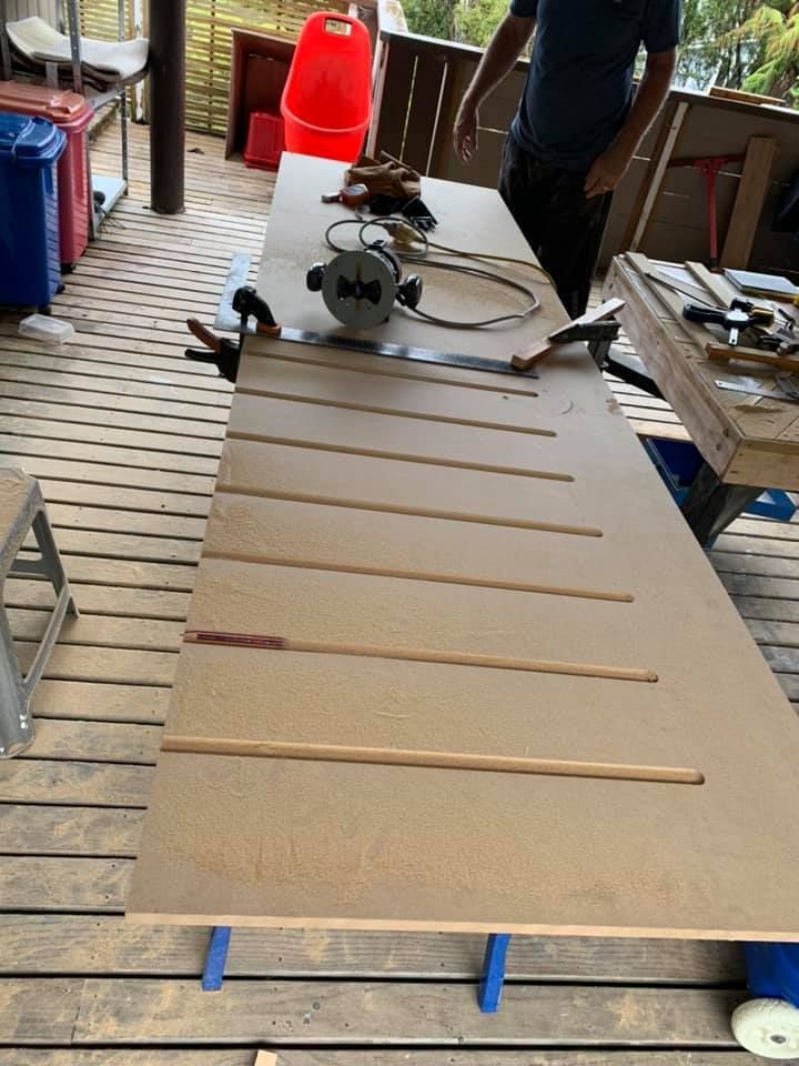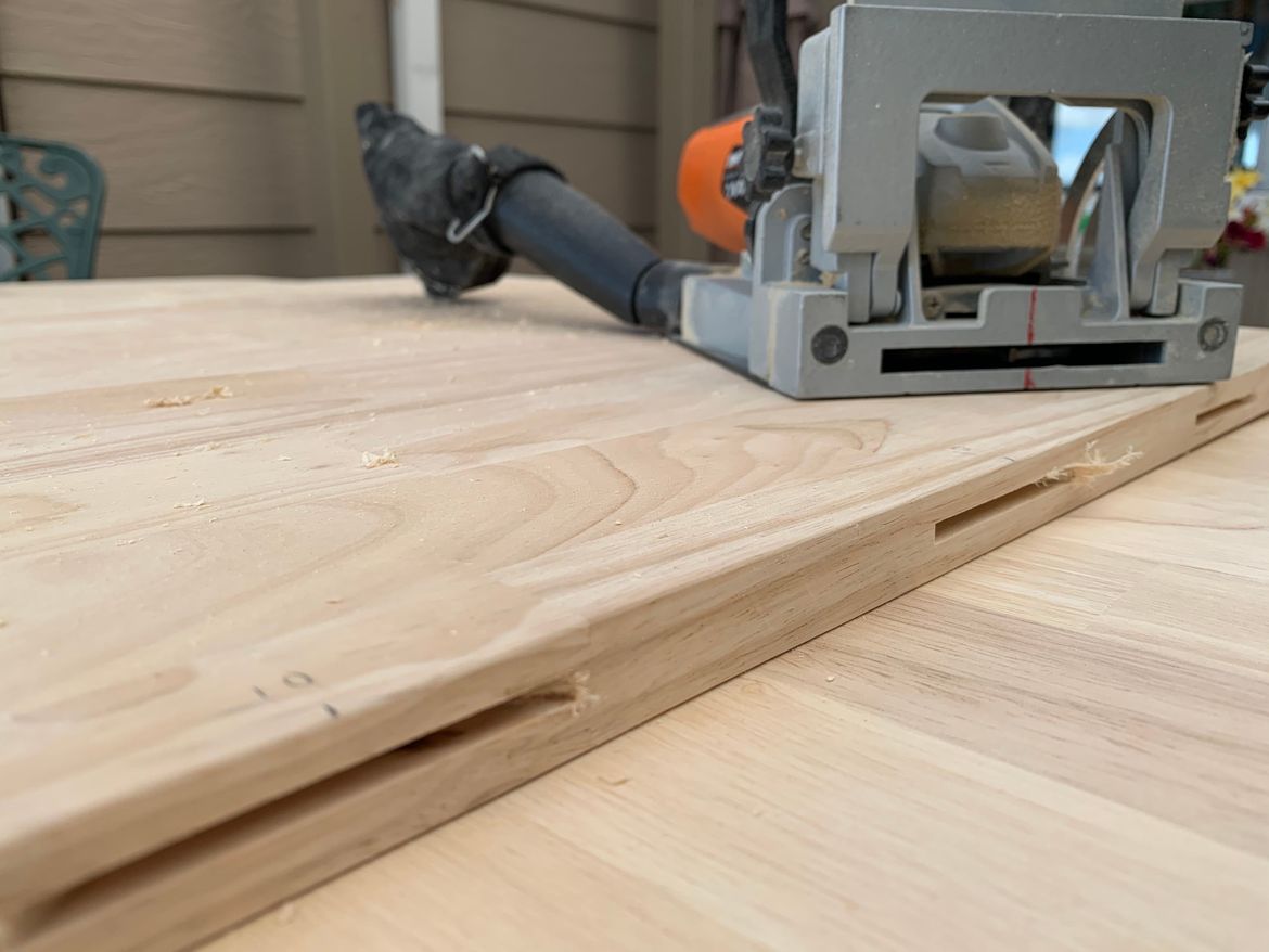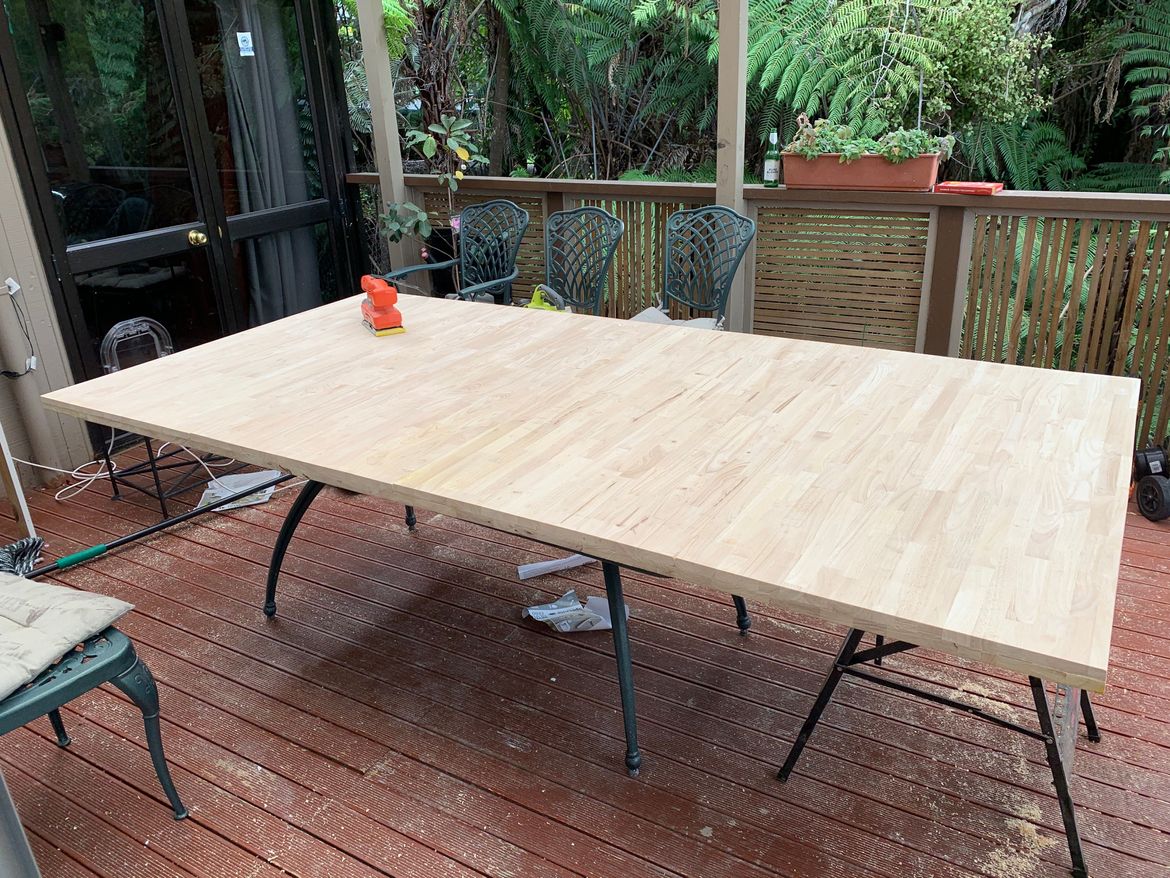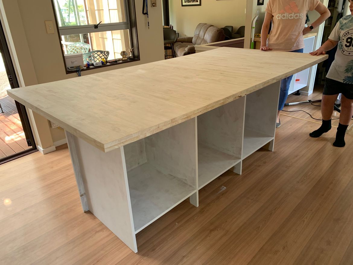 The island ended up being 2.4m x 1.2m. I bought some 1.2m x 600mm Hevea boards from Bunnings, got the biscuit joiner out and put four boards together.