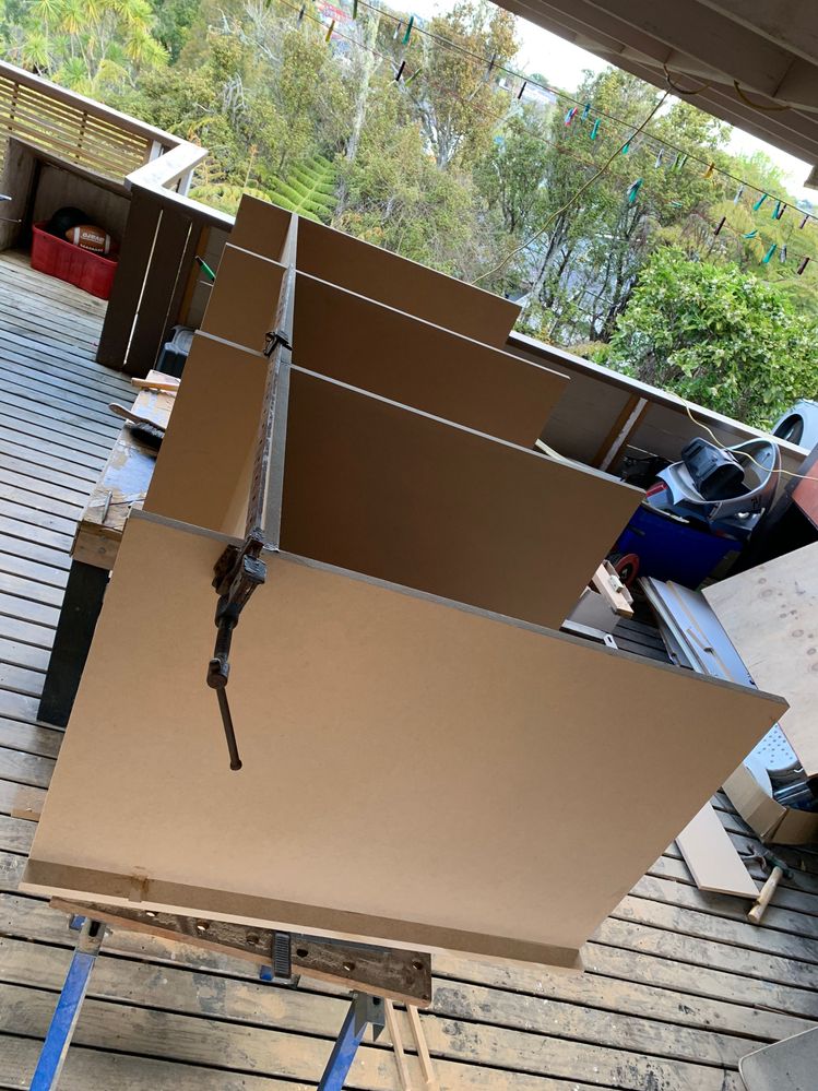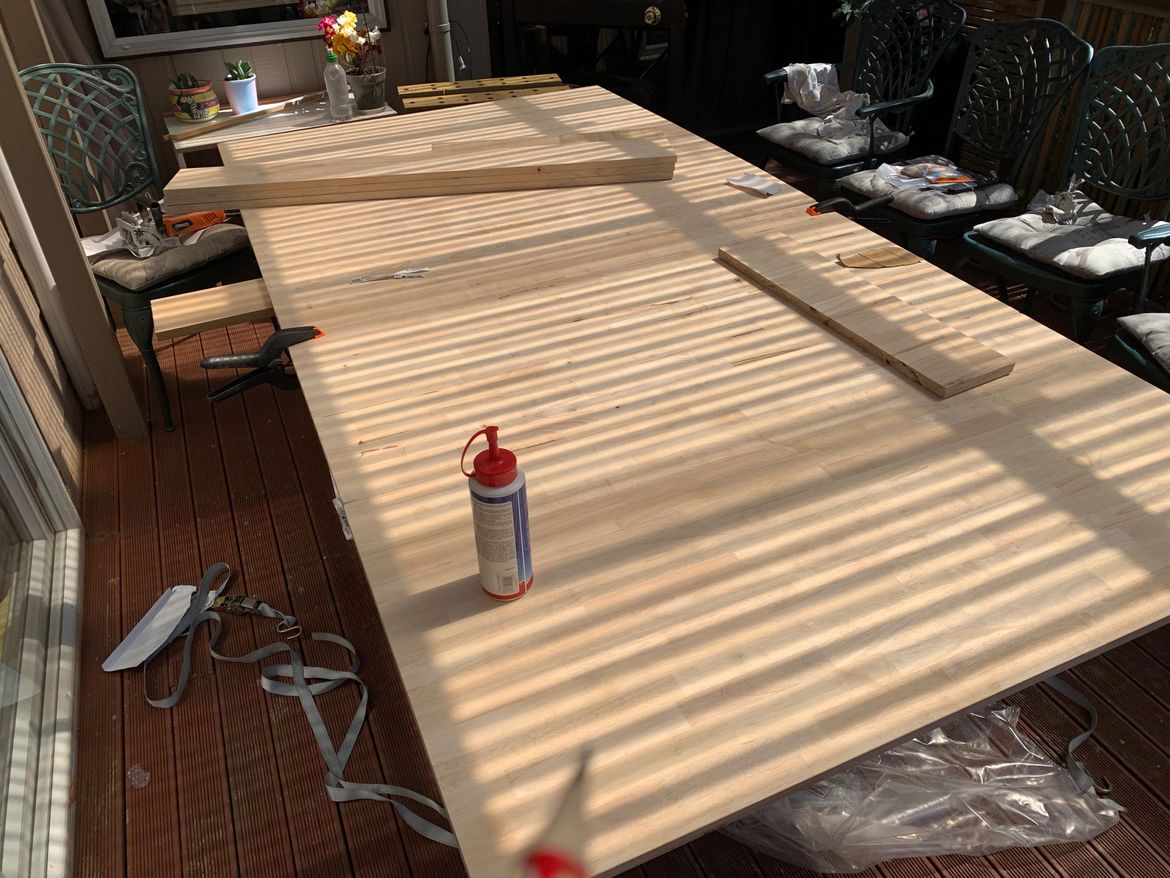I wanted to try double up the edges of the top to make it seem like 36mm tops like the other ones. I cut strips out of the Hevea board and glued them to the underside; at the back I just doubled it up with 18mm MDF offcuts because nobody can see it there.