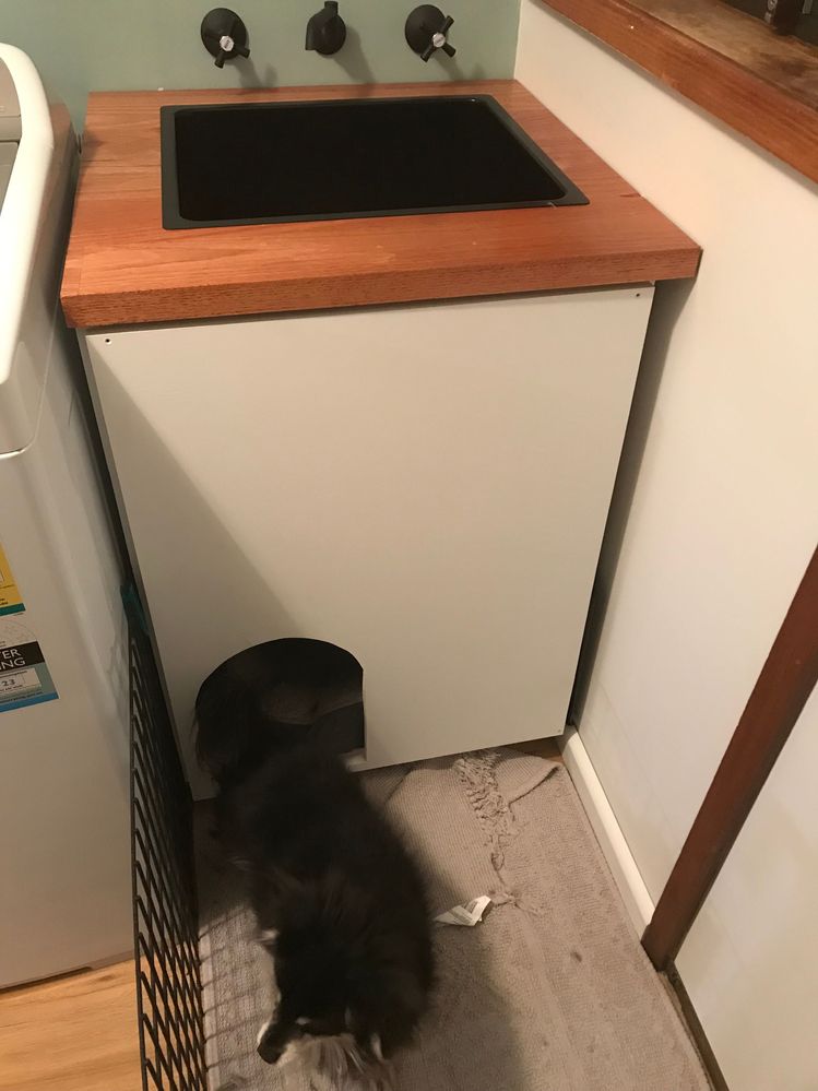 I have a little Maltese Pomeranian dog named Lola. To make sure she loved the laundry as much as we did, I created an in-built doghouse underneath the sink.