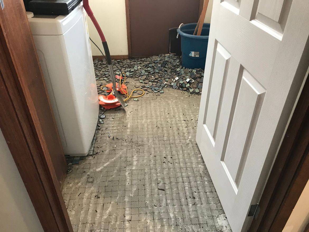 I started by pulling up all the blue tiles with a demolition hammer. This really made the job a lot quicker and easier on the knees. I was able to complete this job in a couple of hours.