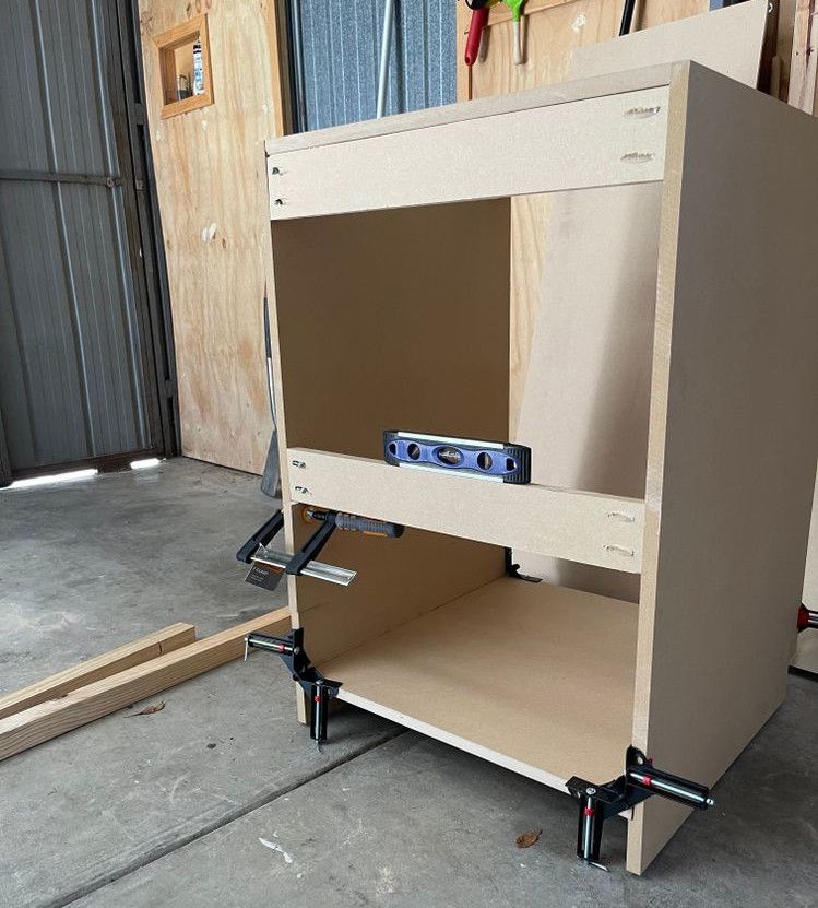 I was able to cut the wood to size using a Makita circular saw and a table saw. I then constructed the cabinets using a Kreg pocket hole jig I purchased from Bunnings. Using the pocket hole jig meant I didn’t need to use clamps and jointing biscuits and have to wait for the glue to dry. This method made constructing the cabinets a lot faster.