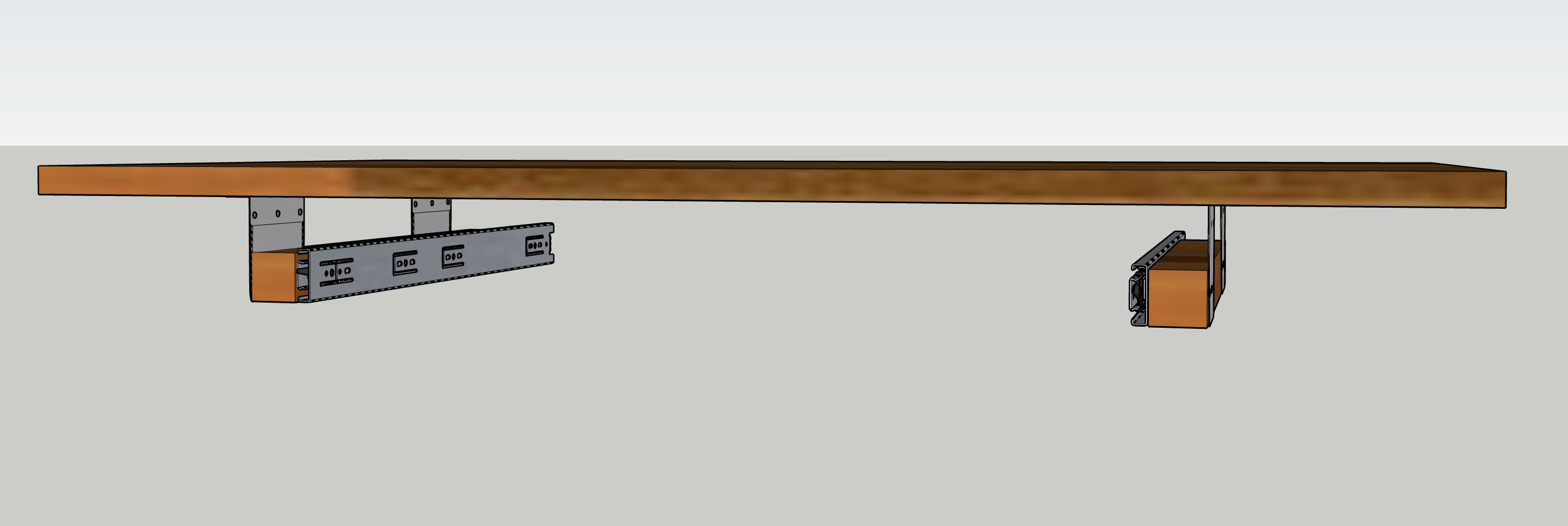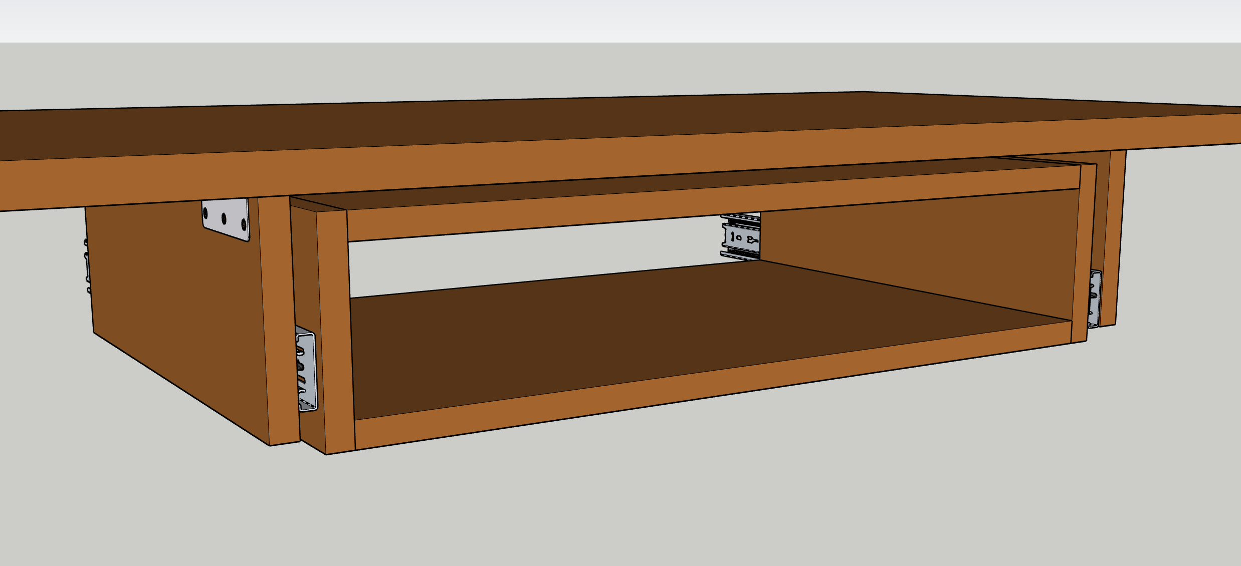 You would then mount two side panels to the underside of the desk using angle brackets and mount the outer part of the slides to these panels.