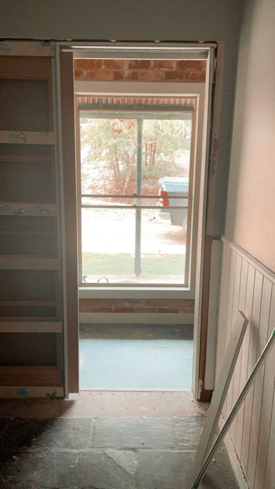 We started by flipping the current sliding door from the left to the right. We did this because we were bringing the current laundry wall forward 800mm and the door wouldn’t fit in its current location, but also to allow for the natural light to come through into the laundry space from the mudroom. We purchased the pocket frame and door from Bunnings.