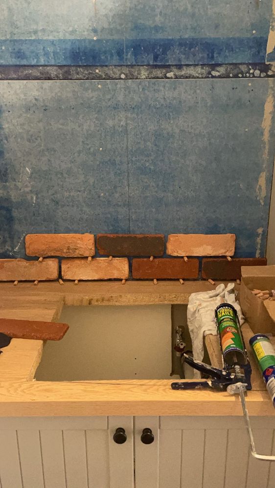 To continue the flow of the mudroom brick, we used brick facings as our splashback, glued onto blue board with liquid nails and then grouted using standard mortar mix.