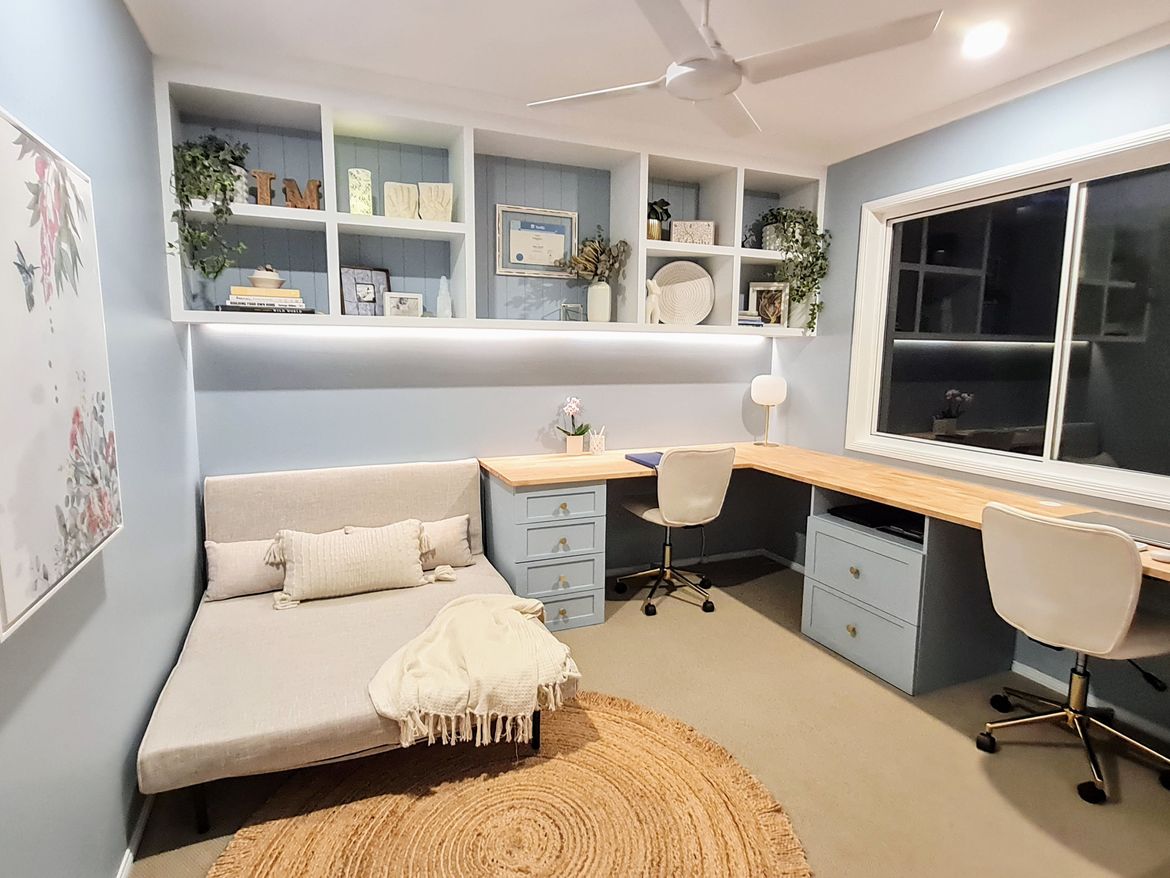 We transformed a guest bedroom into a home office using custom cabinetry from an old kitchen and materials from Bunnings.