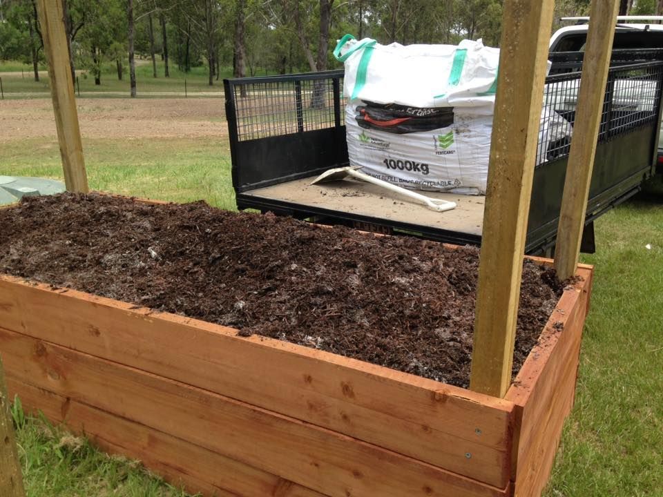 I made two raised garden beds based on the Hugelkultur principle of using woody debris as a garden resource. Three quarters of the beds are filled with branches, logs and sticks, and then back filled with composted soil from our chicken and goats and topped with mushroom compost. Over the course of time, the branches and logs will break down and add lots of goodness into the soil. Once a year when I rotate the crops in the beds, I'll backfill with a good soil.