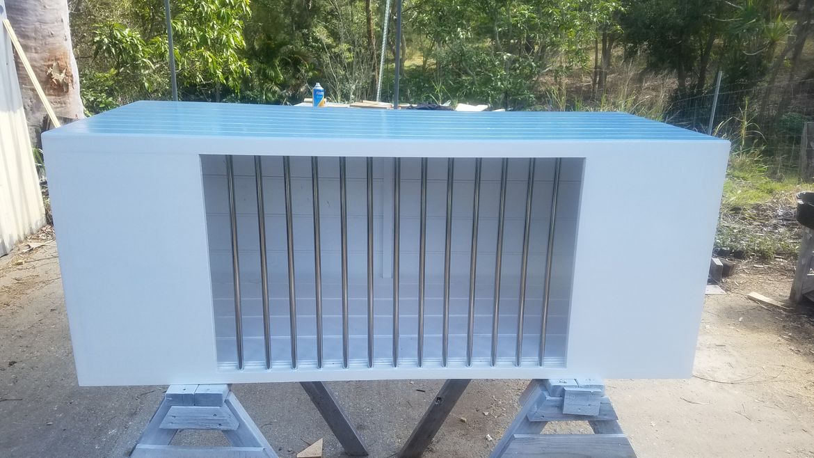 On either side of the front bars there's an 18mm Pine utility panel. The doors at either end are 12mm ply. It's spray painted with four coats of oil-based enamel. I put two dog beds inside and it is now a home for two dachshunds.