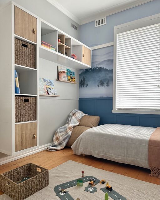 Kids bedroom makeover including timber feature wall, new shelving and storage, plus strip lighting.