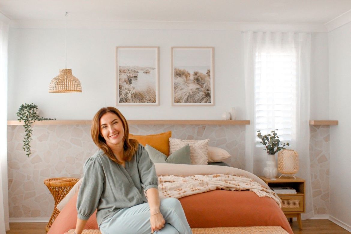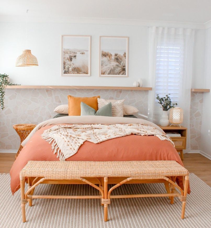 I finished off by installing two picture frames above the floating shelf and assembling a new bed and bedside tables. I purchased the rattan side table and the rattan bench from Bunnings along with the Cortina wool rug.