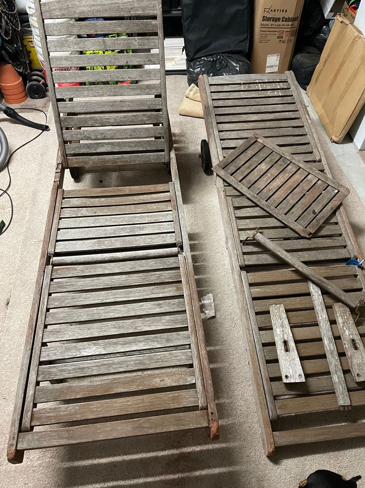 I picked up these two sun lounges and the timber was weathered pretty badly. I spent a bit of time sanding them back and had to replace three bits of the timber slats in the middle of one lounge and remould the rounded timber edging. I sanded both by hand and with a sander.