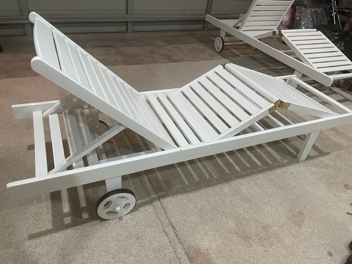 Old and weathered deck chairs repaired, sanded and coated with white outdoor paint.