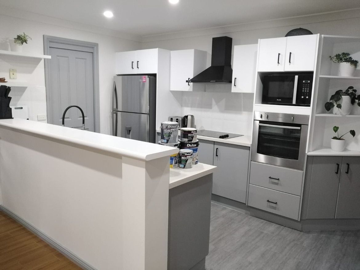 Dulux Renovation Range paint used to revamp a kitchen island and cabinets.