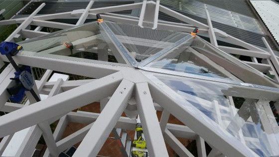 Polycarbonate sheets cut in eight triangles and overlapping by 10mm, held down by 20mm aluminium strips and stainless steel screws. Virtually indestructible.