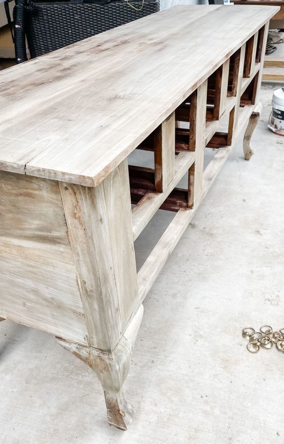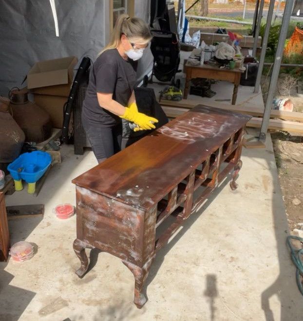 I poured some household bleach into a container and using a Chux cloth I wiped down the cabinet and drawers like you would a stain. Once it’s completely dry you can see the impact of the bleach, to get the look I desired I repeated this step.