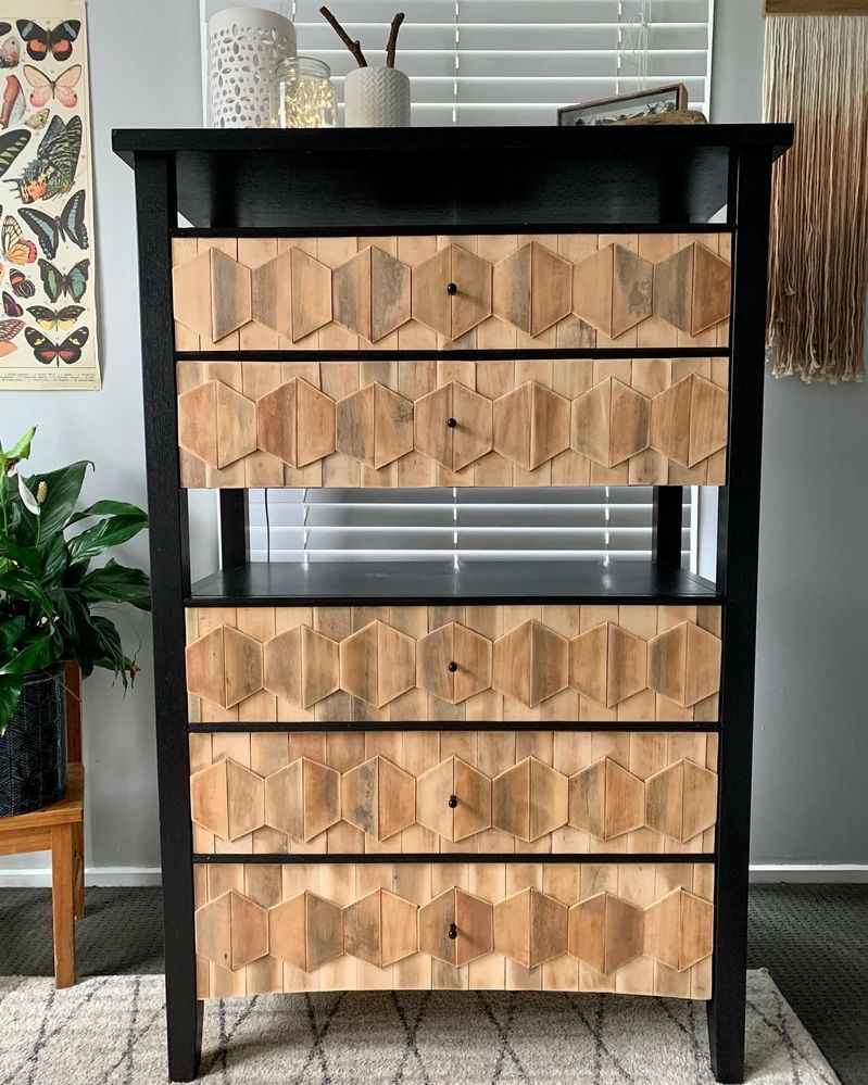 Community member Sandy cleverly upcycled a tallboy using timber Venetian blinds.