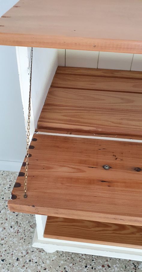 So, I decided to use the top one and add shelves to it all. I stripped and sanded back the top drawer. I found an awesome piece of timber slab to use as the top. I used recycled bed slats as shelves.
