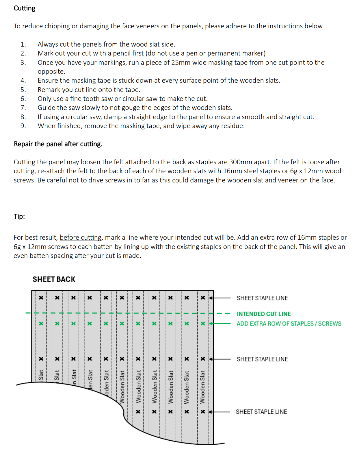As this isn’t just a straight timber panel, unfortunately we’re not able to cut the SpecRite Oak Timber Acoustic Panels on our saws in store due to the felt backing and the nature of the panel. The good news is they definitely can be cut at home. You can use either a fine-toothed hand saw or a circular saw to trim them to the length you need. I’ve included the manufacturer’s cutting specifications below to help you get the best result.